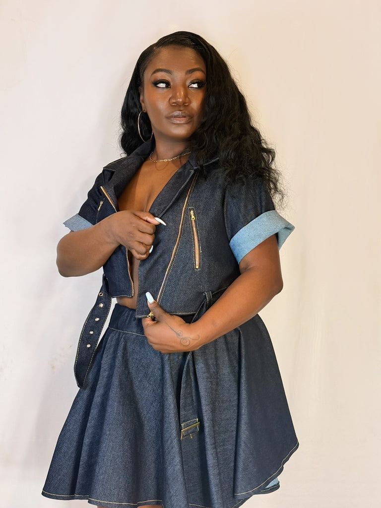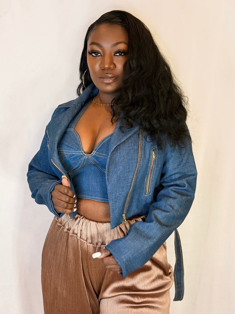 Turn heads and command the room in the Jael Moto Jacket, the ultimate statement piece for the multifaceted woman. Crafted in rich medium & dark-wash denim with bold gold zippers and signature topstitch detailing, this cropped moto redefines what denim can be — structured, sexy, and unapologetically powerful.